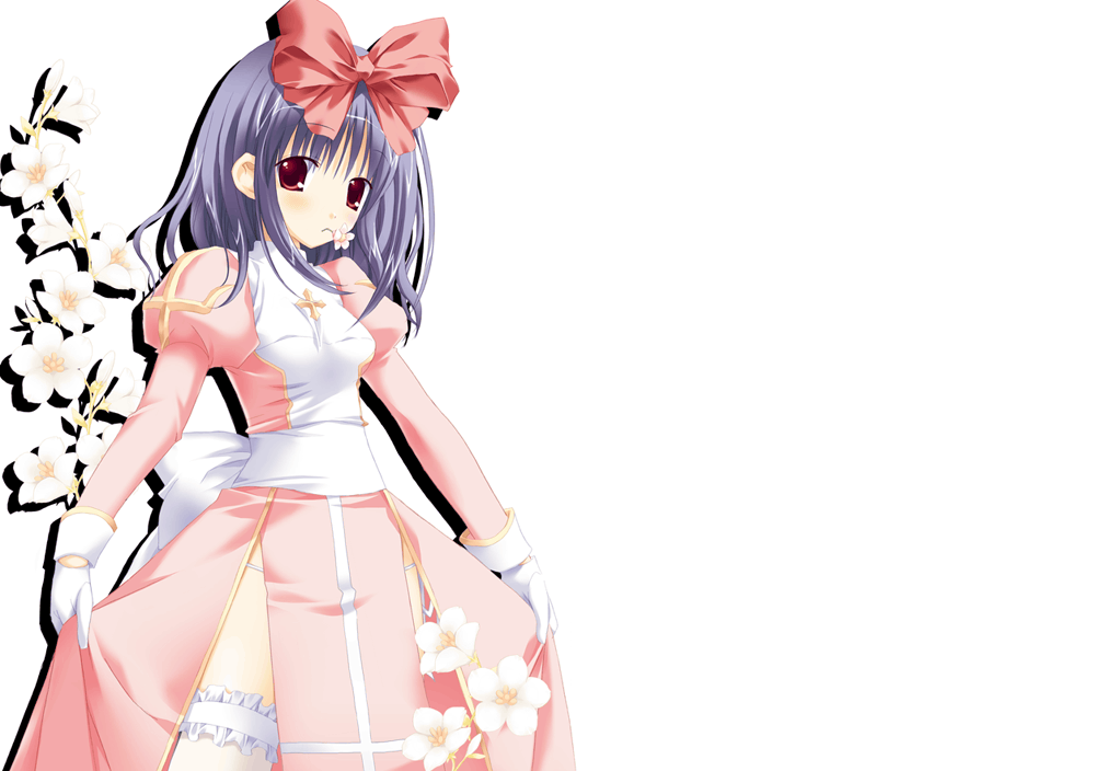 blushdressflowerflower in mouthgloveslong hairpriestesspurple hairred eyesribbonsolothighhighstwo-tone dress