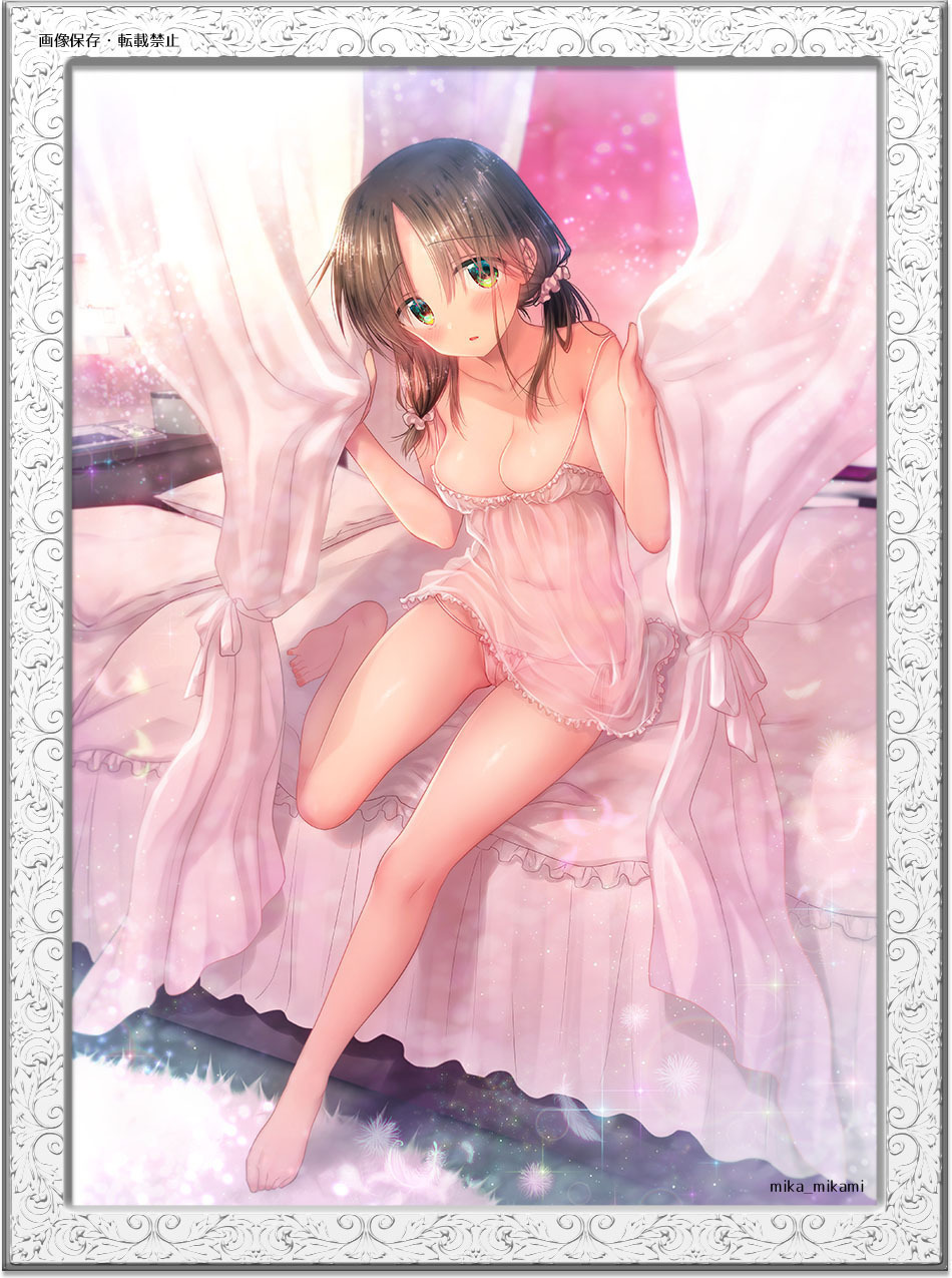 1girlbare shouldersbedblushbra visible through clothesbreastsbrown haircleavagecollarbonecovered erect nipplesdressfull bodygreen eyeshotel roomlong hairlooking at viewerlove hotelmedium breastsnavelon bedopen mouthpantiespillowpink dresssee-through clothessee-through dresssolosweatthighstsukioka yui (oyasumi sex)twintailsunderwear
