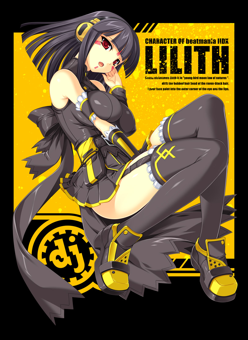 1girlarmbandbare shouldersblack hairblack thighhighsblunt bangsbreastscharacter namedetached sleevesfacial markfemale focusfingernailsgarter strapshead tiltheadphoneslegslong hairlooking at vieweropen mouthpouchred eyesshoesskirtsleevelesssolothighhighsthighs