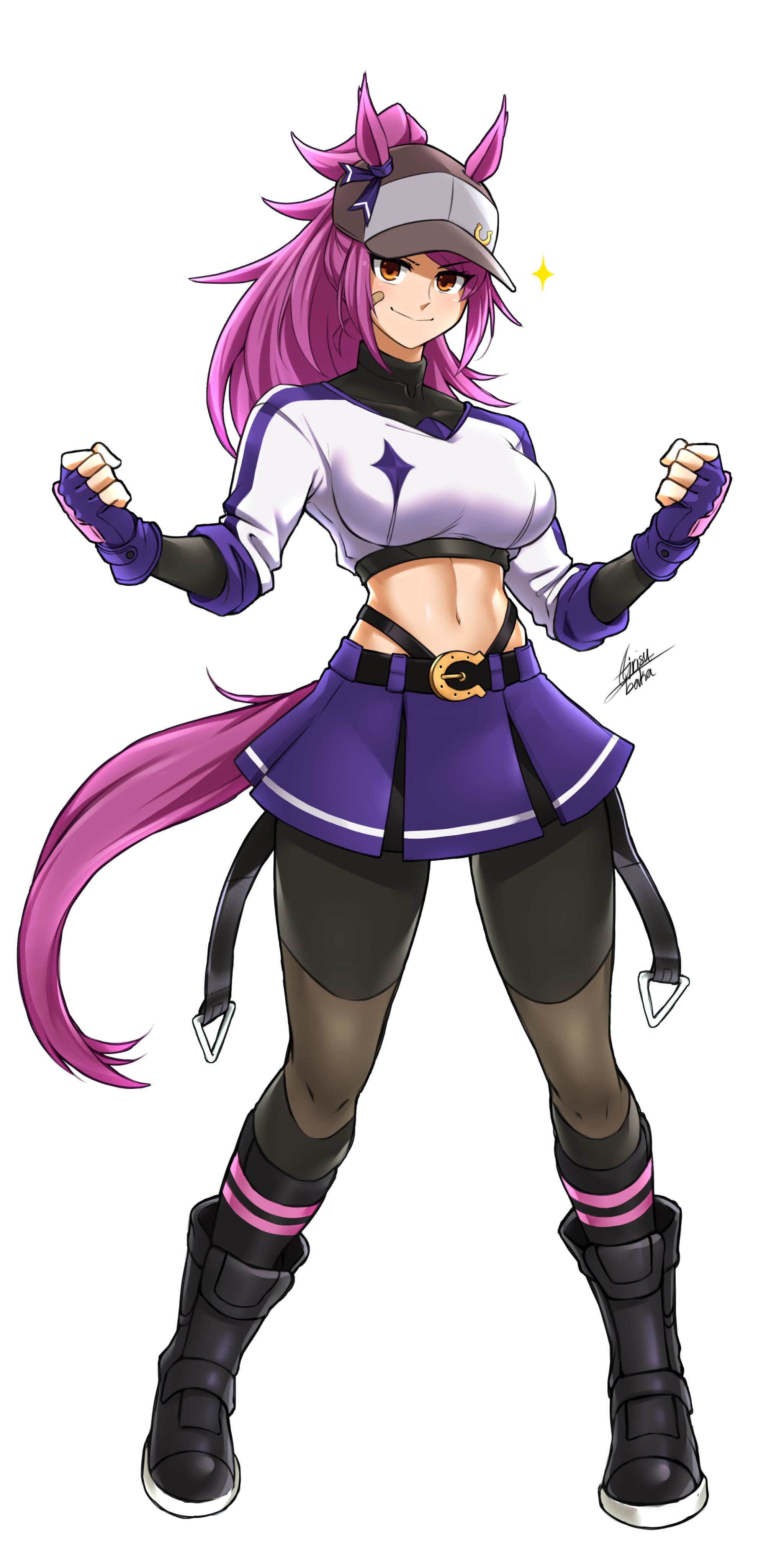 1girlanimal earsartist namebandaidbandaid on cheekbandaid on facebaseball capbeltbelt buckleblack bootsbootsbuckleclenched handscropped shirtears through headwearfingerless glovesfull bodygloveshathorse earshorse girlhorse tailhorseshoekemonomimi modeknee bootslegs apartlong hairlooking at viewermidriffnavelorange eyespantyhosepleated skirtponytailpurple glovespurple hairpurple skirtsignaturesimple backgroundskirtsmilesolosparklestandingtailwhite background