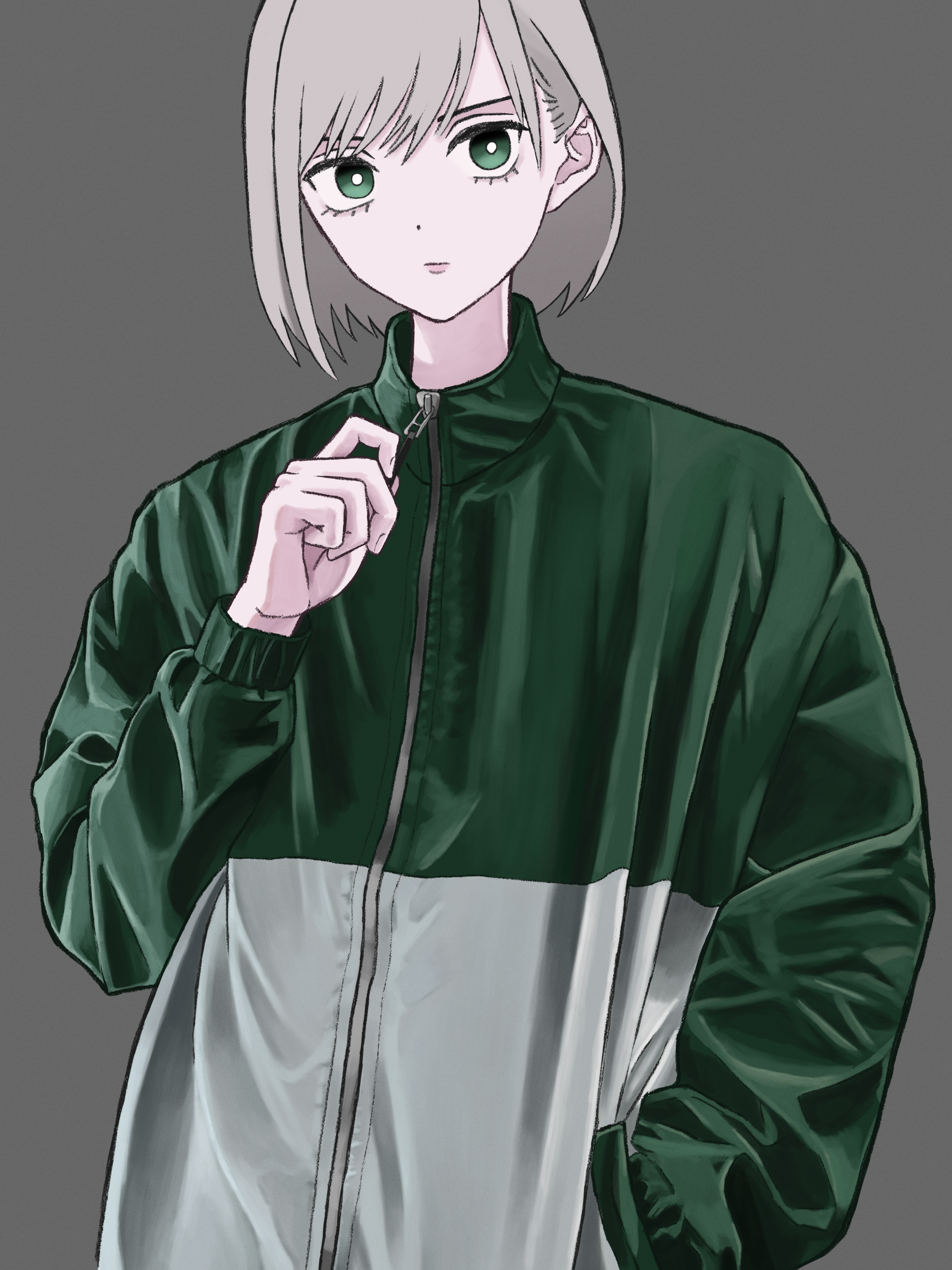 1girlclosed mouthdot noseeyelashesgreen eyesgreen jacketgrey backgroundgrey hairhand in pockethand upholdingjacketlipslong sleeveslooking at viewermedium hairmulticolored jacketsimple backgroundsolotwo-tone jacketupper bodyzipper pull tab
