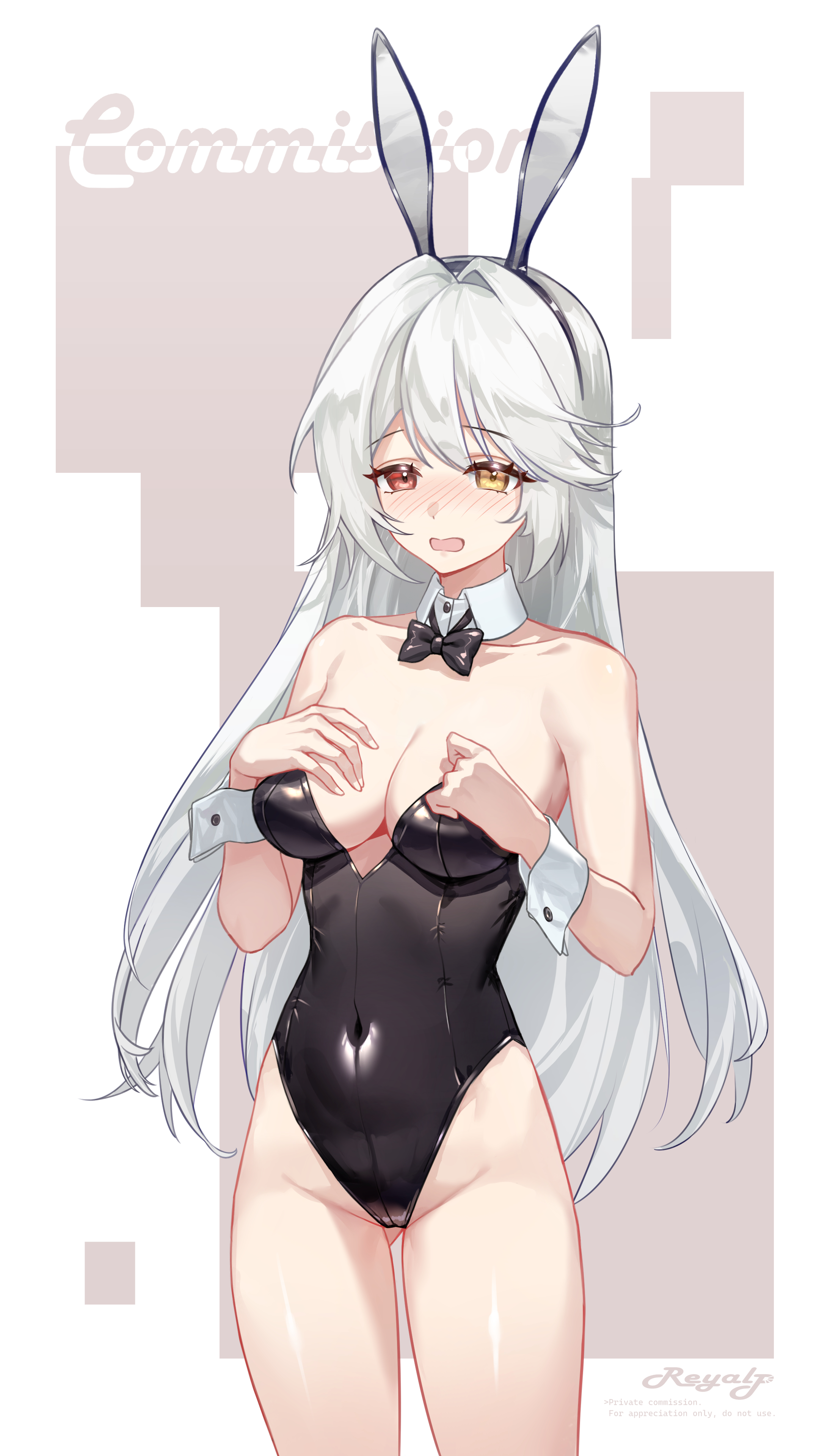 1girlanimal ear hairbandanimal earsblack bowblack bowtieblack leotardbowbowtiebreastscleavagecovered naveldetached collarfake animal earshairbandheterochromialarge breastsleotardplayboy bunnyrabbit earsrabbit tailred eyessolostraplessstrapless leotardtailwrist cuffsyellow eyes