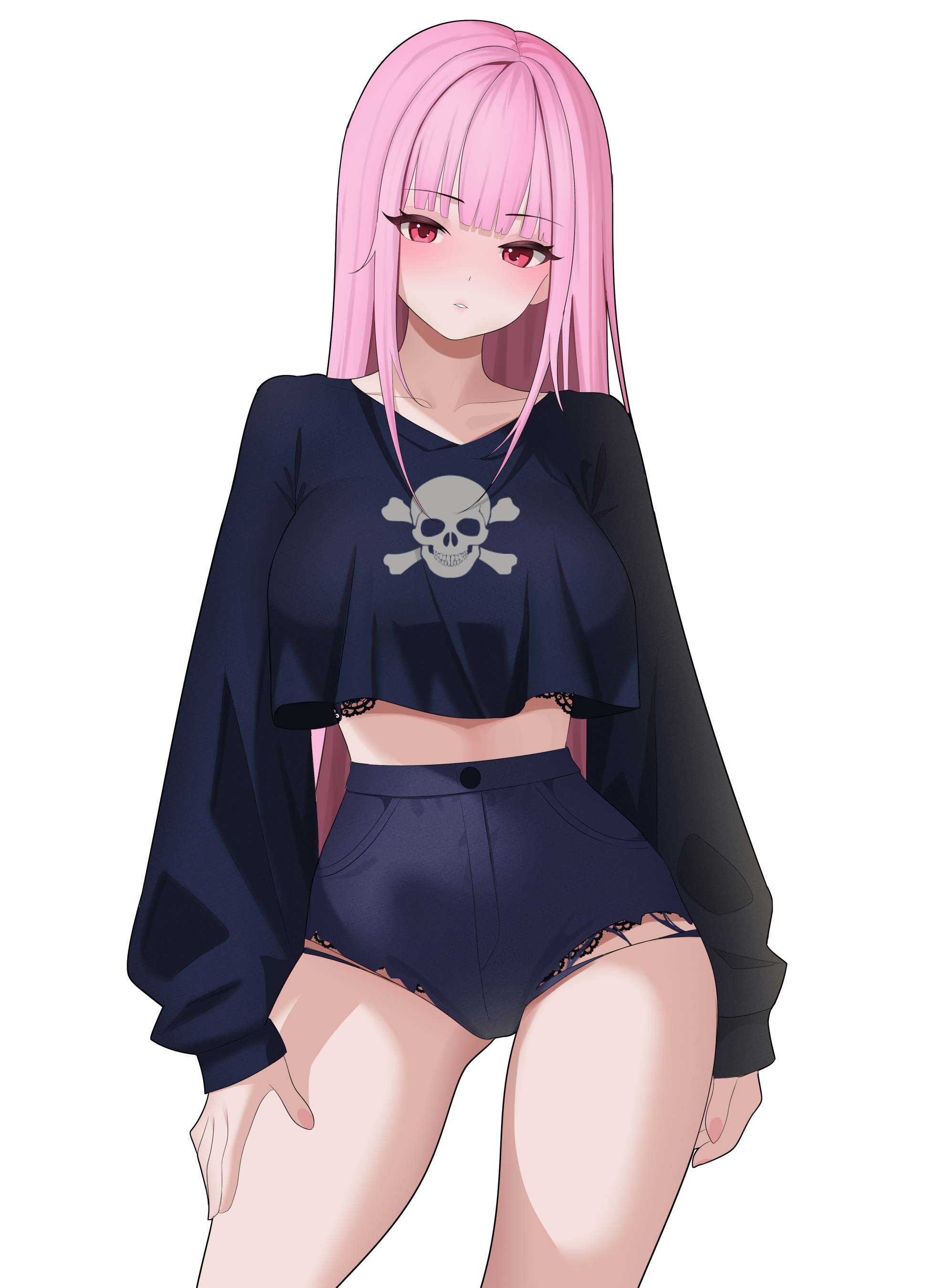 1girlblue shirtblue shortsblushbreastscollarbonecontrappostofingernailslace trimlarge breastslong hairlong sleeveslooking at viewerparted lipspink eyespink hairpink lipspink nailsshirtshirt overhangshortssimple backgroundskull printsolothighstorn clothestorn shortsvirtual youtuberwhite background