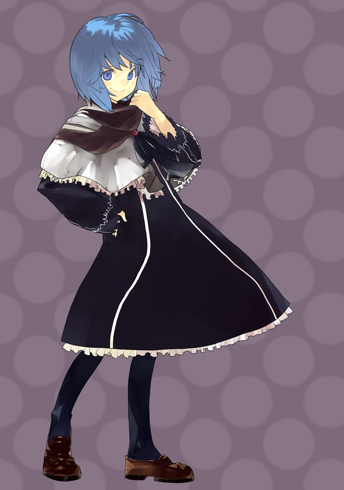 1girlblue eyesblue hairdressfemale focusfrillsfull bodymatching hair/eyespantyhosescarfshort hairsmilesolo