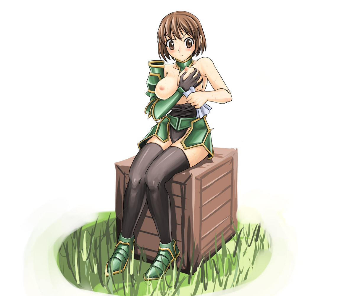 1girlarmorbreastsbrown eyesbrown hairfemale focusnipplesshort hairsolothighhighstopless female