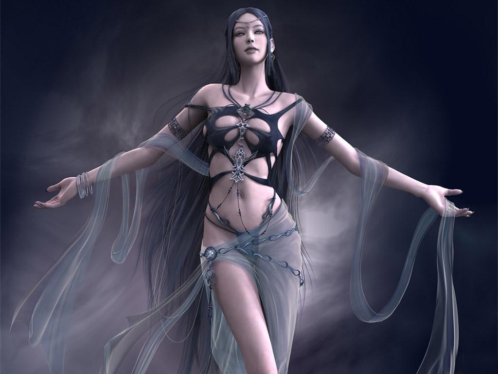 1girl3darmbandblack hairbreastsbrown eyescolored skincowboy shotfemale focusnavelpantiespurple skinsee-through clothessolostandingunderwearveil