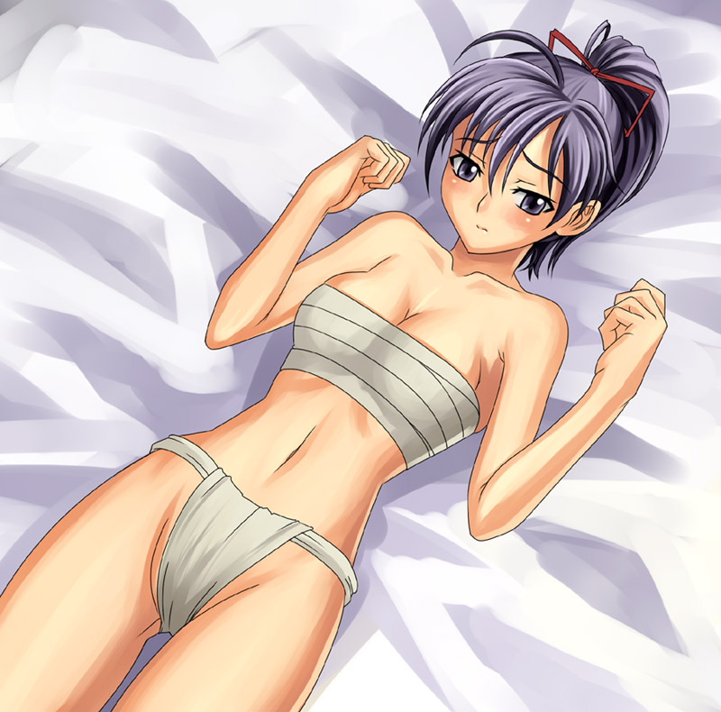 1girlbandagesbedblack hairblushbreastscleavagefemale focusfundoshigrey eyesjapanese clothesmedium breastsnavelponytailsarashishort hairsolo