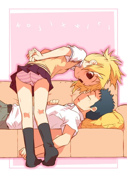00s1boy1girlblonde haircouchfeetkneehighslolipantiespantyshotponytailschool uniformsleepingsocksstriped clothesstriped pantiesunderwear