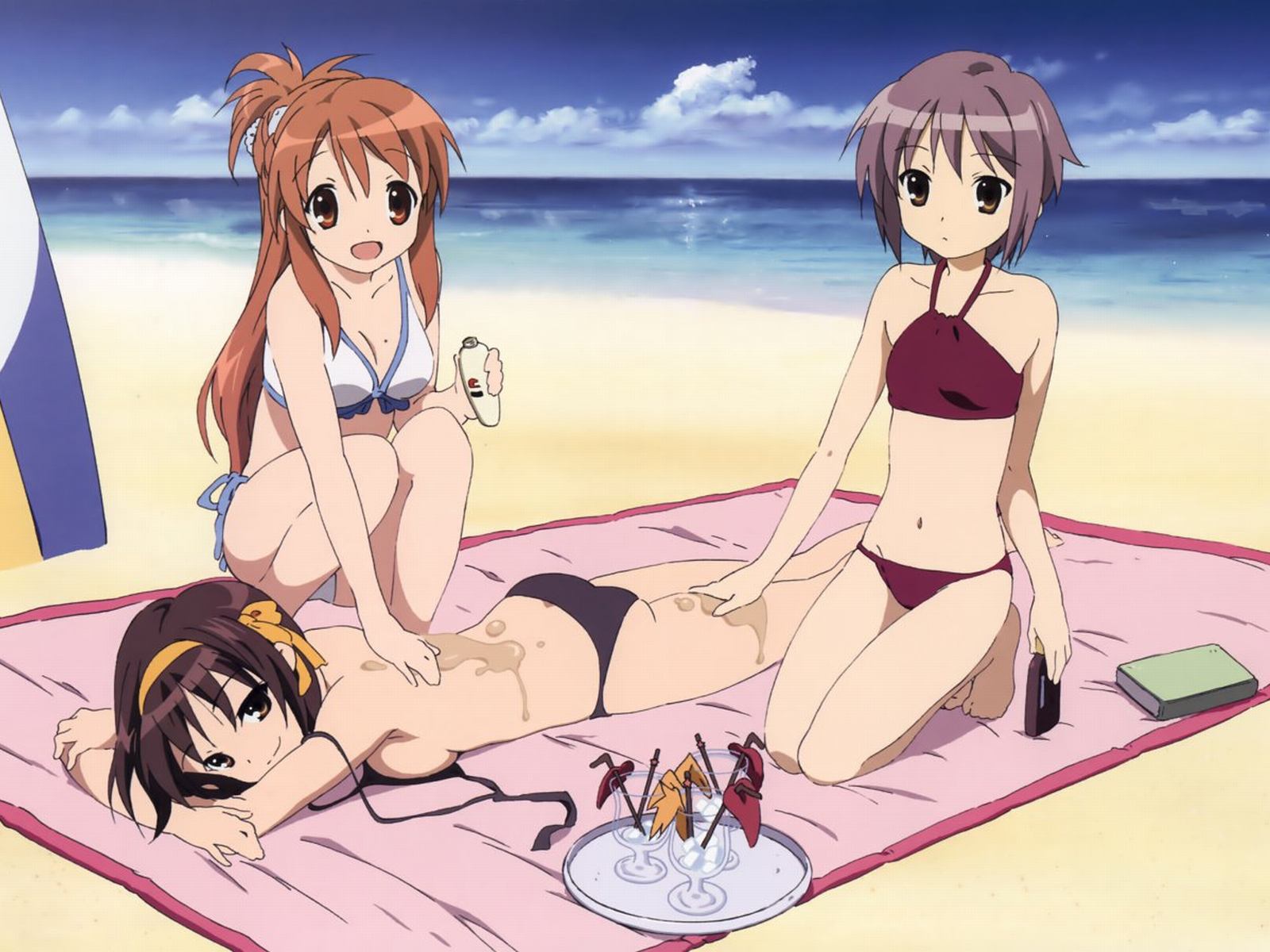 nao (artist), asahina mikuru, koizumi itsuki, kyon, nagato yuki, suzumiya haruhi, suzumiya haruhi no yuuutsu, highres, 00s, 2boys, 3girls, armband, brown hair, from above, maid, multiple boys, multiple girls, school uniform, serafuku, short hair, train, train interior