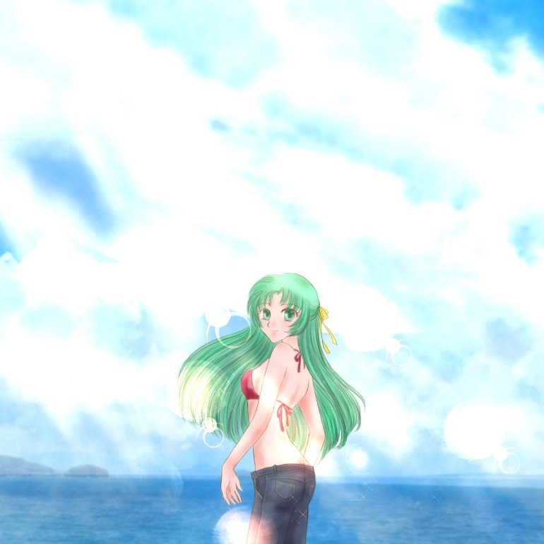 00s1girlbikinibikini top onlyclouddaydenimfemale focusgreen eyesgreen hairhalf updojeanslong hairmatching hair/eyesoceanoutdoorspantsribbonskysoloswimsuit