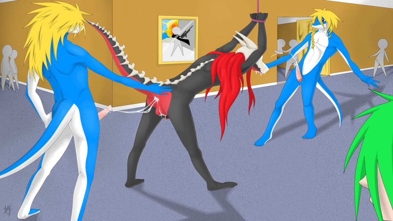 maruko gaku, sumino takumi, the hundred line -last defense academy-, commentary request, translation request, 2boys, ahoge, animal ears, animalization, arms between legs, black bow, black bowtie, black hair, black hairband, black necktie, black pants, black shoes, black shorts, black vest, bow, bowtie, eyelashes, fake animal ears, full body, grin, hair between eyes, hairband, holding, holding sign, legwear garter, long sleeves, male focus, multicolored hair, multiple boys, necktie, pants, purple eyes, rabbit, rabbit ears, rabbit tail, red eyes, red hair, shoes, short hair, shorts, sign, simple background, sitting, smile, socks, streaked hair, sweat, tail, torinikuoiccc, two-tone hair, vest, white background, white socks