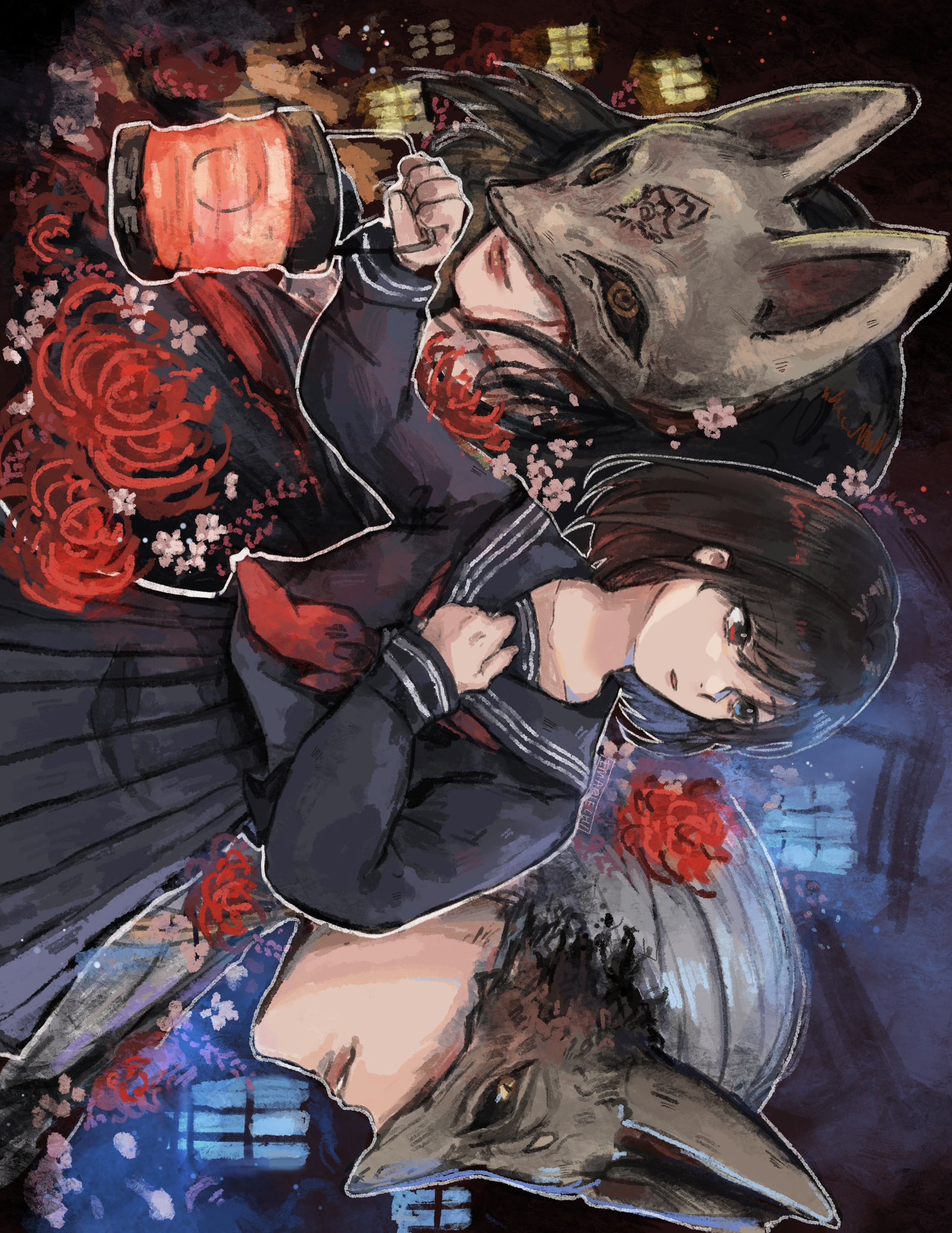 1boy1girlblack sailor collarblack serafukuemariechiifox maskjapanese clothesmaskneckerchiefred neckerchiefsailor collarschool uniformserafuku