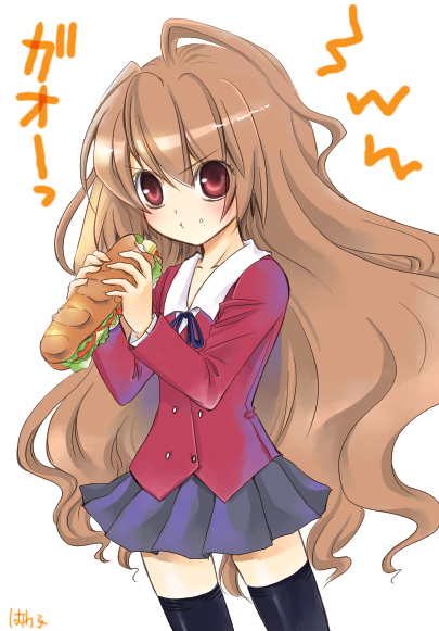 00sbrown hairflat chestfoodlong hairred eyessandwichschool uniformsolothighhighsvery long hair