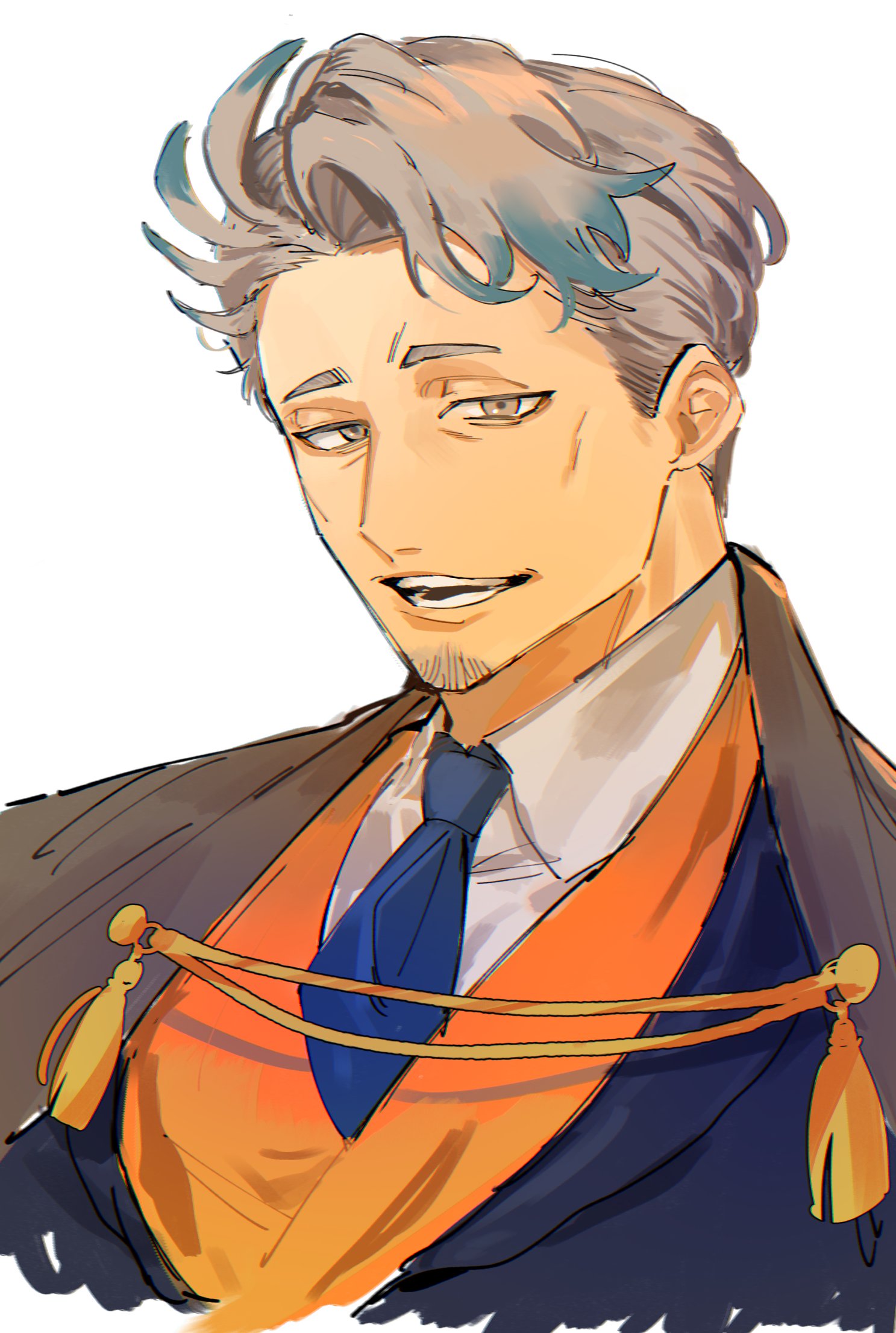 1boyblue corsetblue necktieblue streaksbrown capebrown eyescapecorsetfacial hairgoateekatsu kaishu (fate)looking at viewermale focusnecktieoldold manopen mouthorange shirtshirtsimple backgroundsmilesolowhite backgroundwhite hairwhite shirt