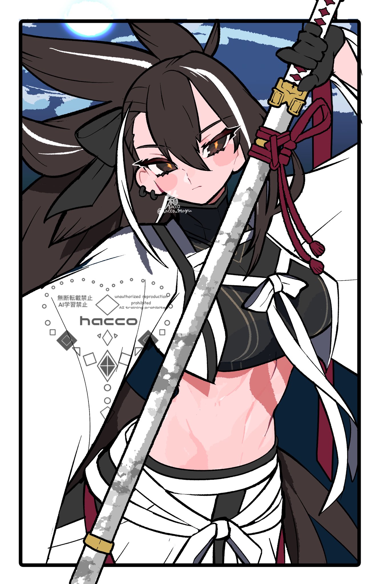 1girlblack glovesblack hairblack shirtblushbreastsbrown eyescropped jacketcropped shirtgloveshakamajacketjapanese clotheskatanalong hairlong sleeveslooking at viewermedium breastsmidriffmulticolored hairnavelshirtsidelockssolostreaked hairswordweaponwhite hairwhite hakamawhite jacketwide sleeves