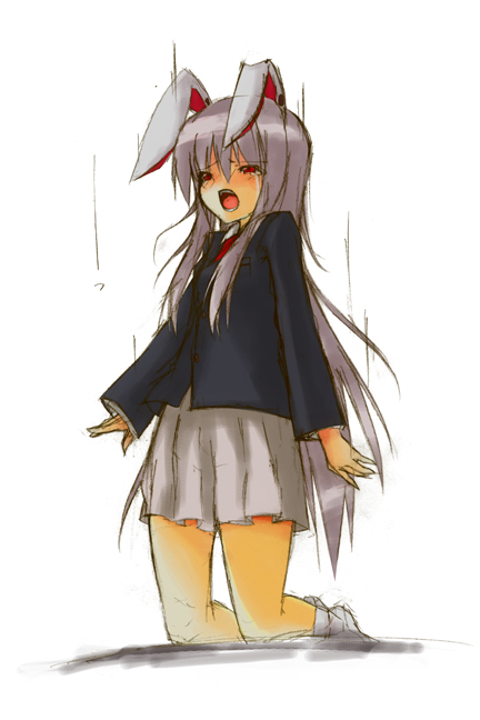 1girlanimal earsblazerblousecollared shirtfemale focusfull bodyjacketkneelinglong hairpurple hairrabbit earsred eyesshirtskirtsolotearsvery long hairwhite backgroundwhite shirt