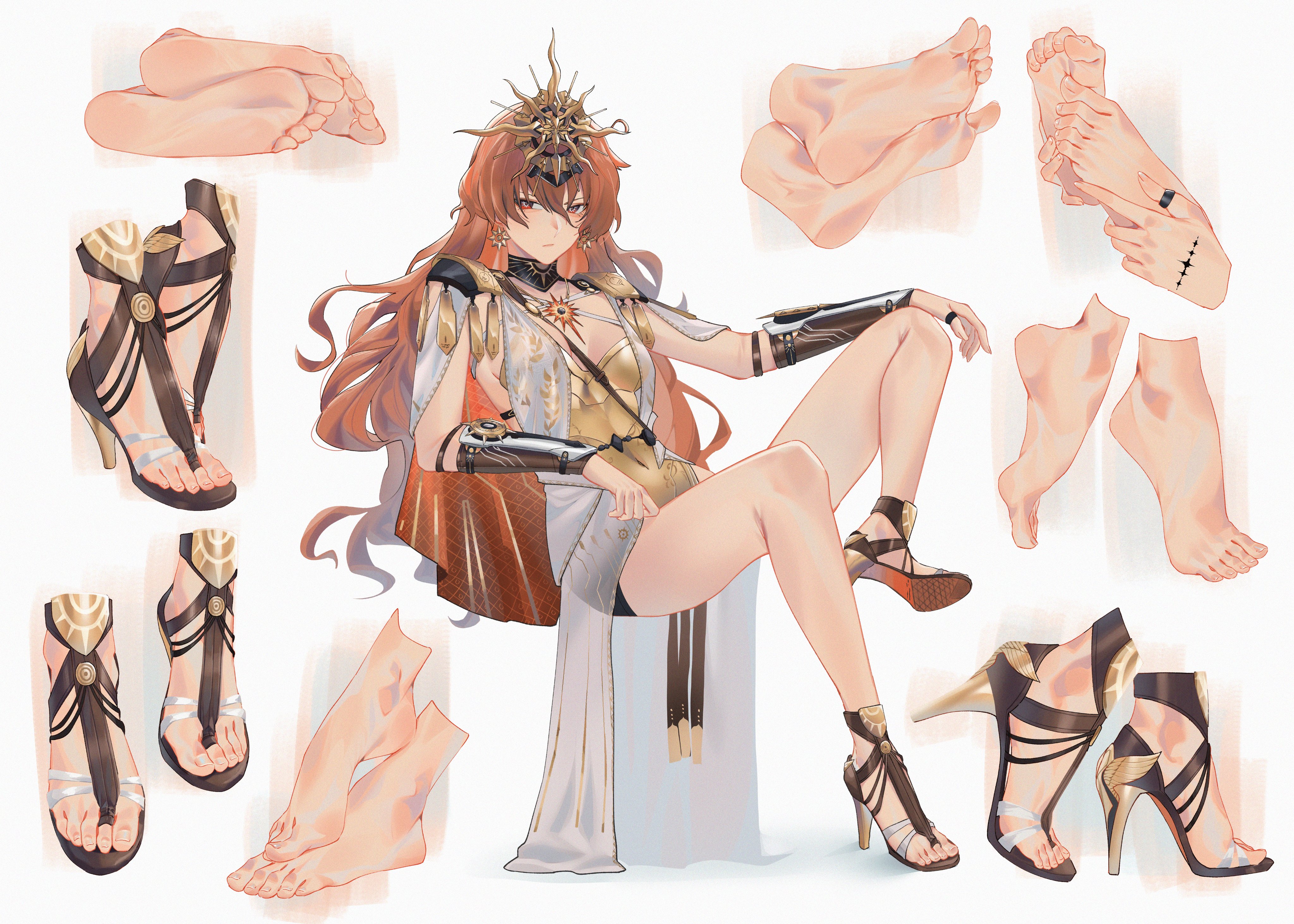 1girlancient greek clothesarm armorarmorbare legsbarefootblack collarbreastplatebreastsclosed mouthcollardressearringsfeetfoot focusgreco-roman clotheshair between eyesheadgearhigh heelsinvisible chairjewelrylegslong hairlooking at viewermedium breastsmultiple viewsorange eyesorange hairringsittingsolessun earringssun necklacetacet mark (wuthering waves)toeswhite dress