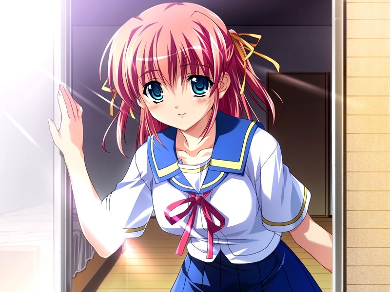 1girlblue eyesblushcollarbonedoorwayfemale focushair ribbonred hairribbonschool uniformsmilesolosunlight