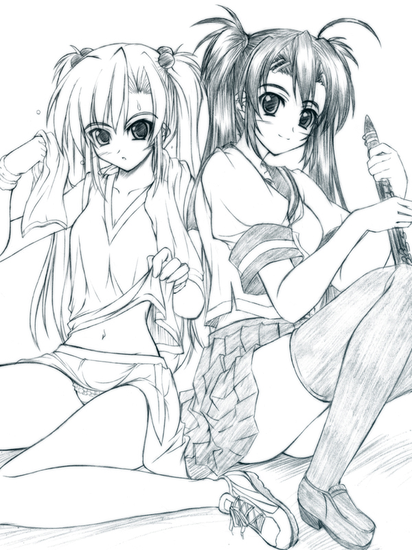2girlsaqua themeblue themeclarinethair ornamenthairclipinstrumentlong hairmonochromemultiple girlsnavelpantiespantyshotschoolshoessittingskirtsweatthighhighstwintailsunderwear