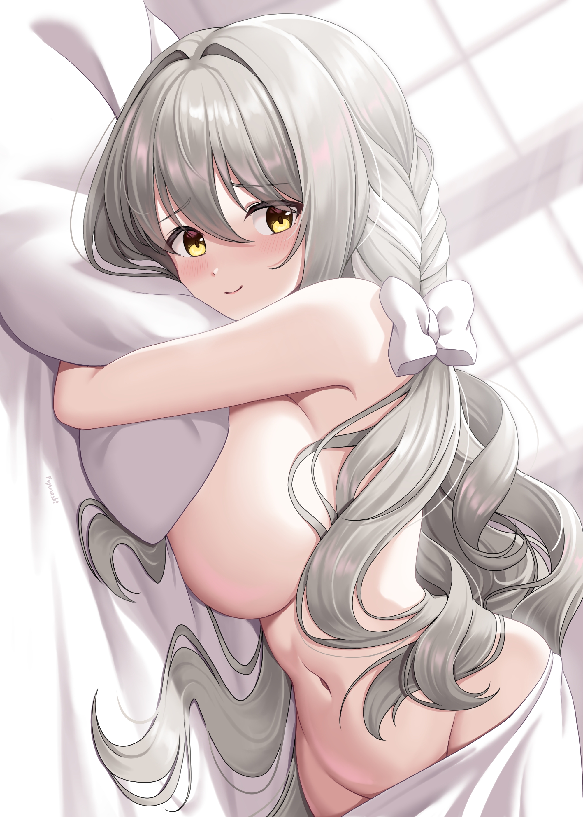 1girlalternate breast size (larger)blanketblushbraidbreastscompletely nudegrey hairgroinhair between eyeslarge breastslong hairlooking at viewerlyingmulticolored hairnavelnudeon bedsideboobsmilesolotwo-tone hairwavy hairwhite hair