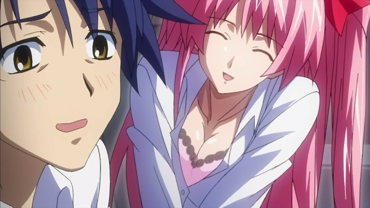 00s1boy1girlblue hairblushbrabreastscleavagedress shirtlingerielong hairpink hairribbonshirtsmileunderwear
