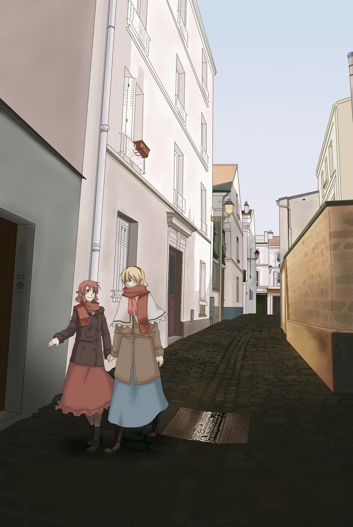 2girlsalternate costumebuildingcontemporaryfemale focusholding handsmultiple girlsscarfscenery