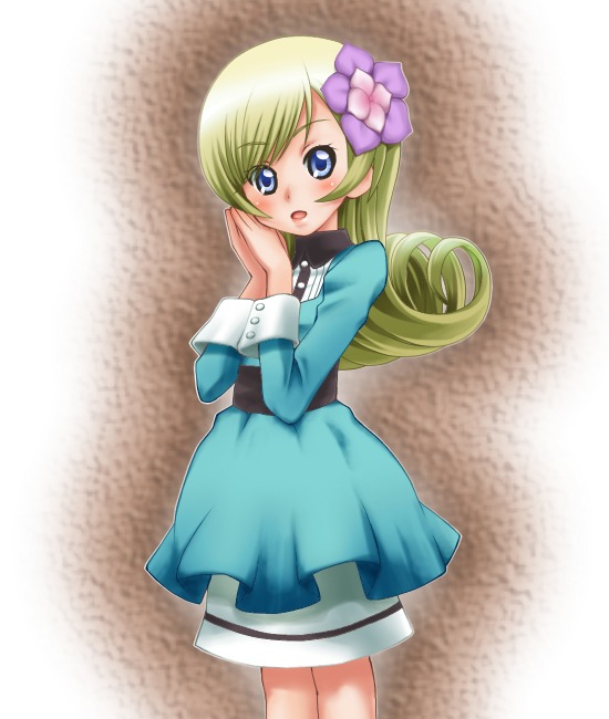 1girlblonde hairblue dressblue eyesblushcurly hairdressfemale focuslong sleeveslooking at viewerlooking backsolostanding