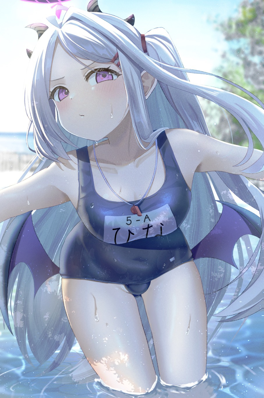 1girlahogealternate breast size (larger)black halobreastsdaydemon girldemon hornsdemon wingsgluteal foldhalohornslong hairlooking at viewerlow wingsmedium breastsold school swimsuitoutdoorspurple eyesschool swimsuitsolostandingswimsuitwhite hairwings