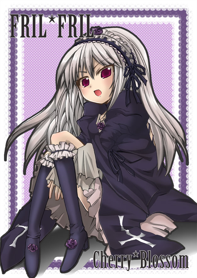 :o00sblushbootsdressfrillsgothic lolitahairbandhigh heelsknee bootslolita fashionlong hairopen mouthpurple eyesshoessittingsolo