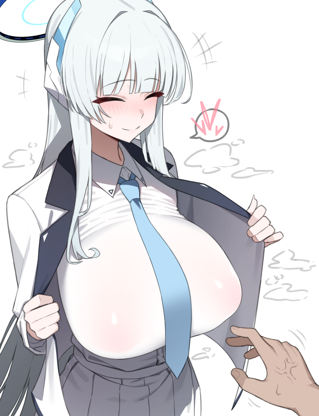 1boy1girlblue necktieblushbreastsclosed eyesgrey hairhaloheadgearhearthuge breastsjacketlong hairnecktieopen clothesopen jacketpleated skirtshirtsimple backgroundskirtspoken heartstraight hairsweatdropveinsveiny handsvery long hairwhite backgroundwhite jacketwhite shirtwhite skirt