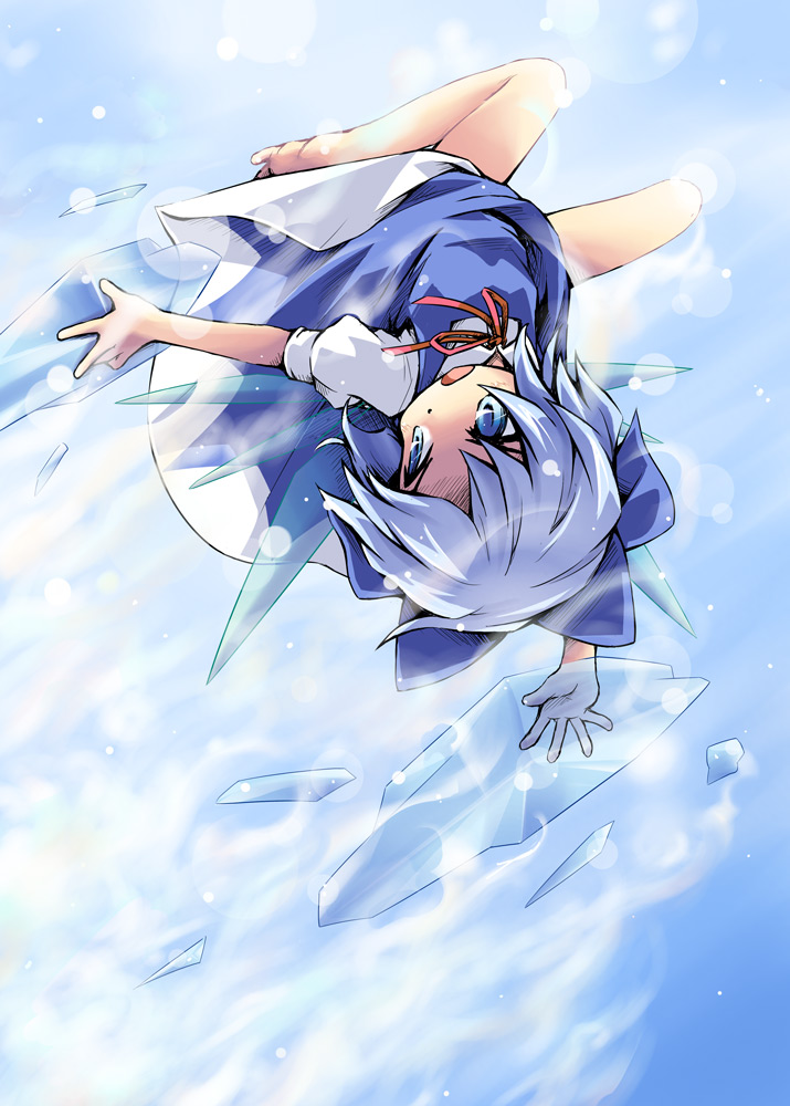 1girlbarefootblue eyesblue hairdressfairyfemale focusflyinggradient backgroundiceiciclematching hair/eyesribbonskysolosunlightupside-down