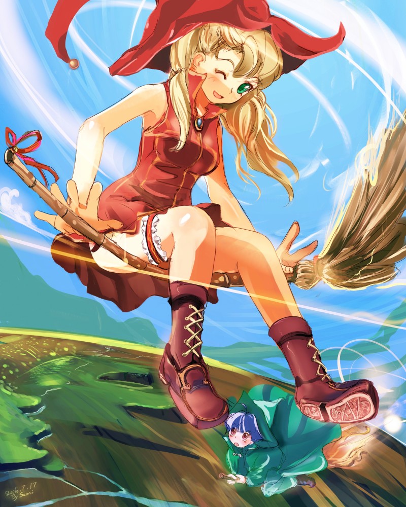 2girlsblonde hairblushbroombroom ridinggreen eyeshatmultiple girlsone eye closedsidesaddlesleevelesswinkwitchwitch hat
