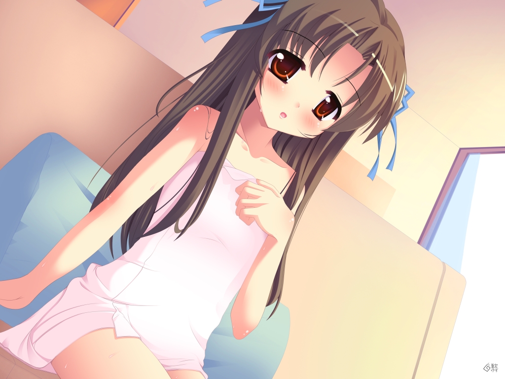 1girlblushbowbrown hairchildfemale focusflat chesthair bowlong hairnaked towelopen mouthred eyessolotowelwet