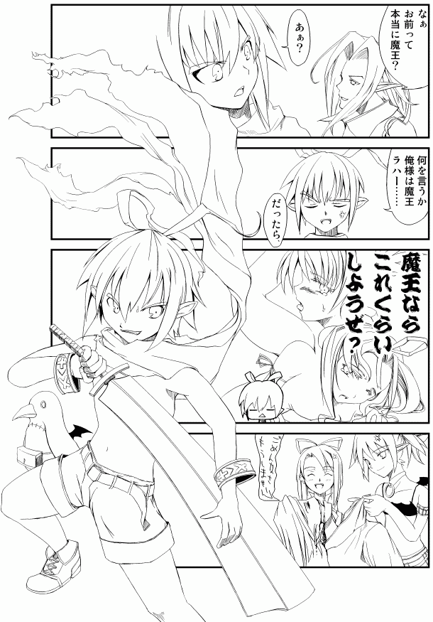 2boys2girlsbeltgreyscalemidbossmonochromemultiple boysmultiple girlspointy earsshoesshortsswordweapon