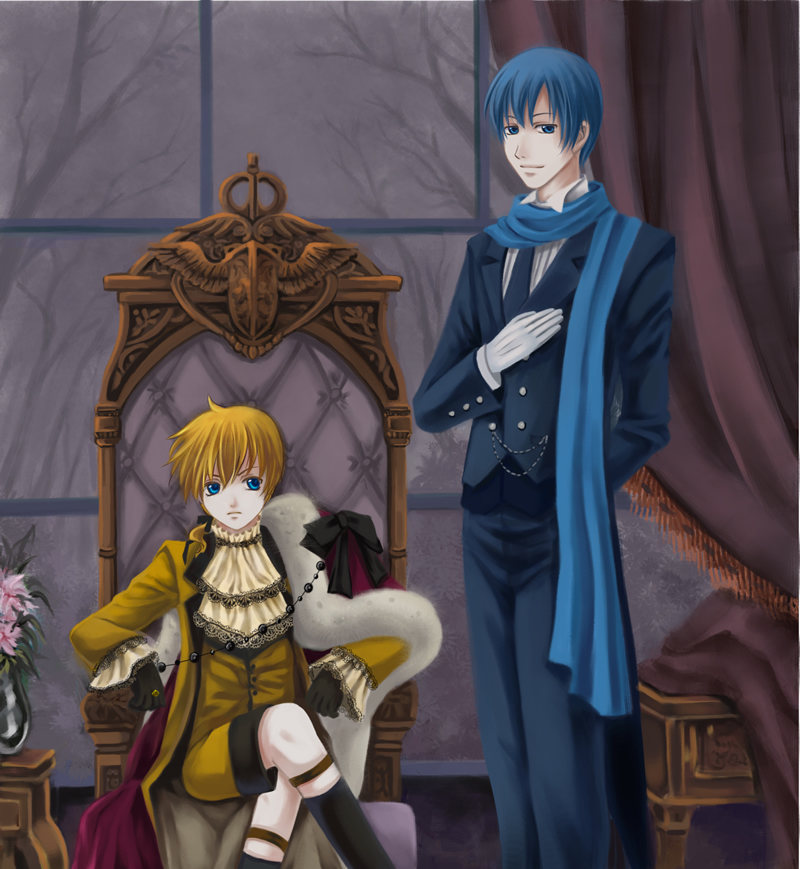 2boysbare treeblack bowblack glovesblonde hairblue eyesblue hairblue scarfblue suitbowcapecurtainsflowerflower potformal clothesfur capegloveslong sleevesmale focusmultiple boysparodyscarfshortssuitthronetreevasewhite gloveswindowyellow shorts