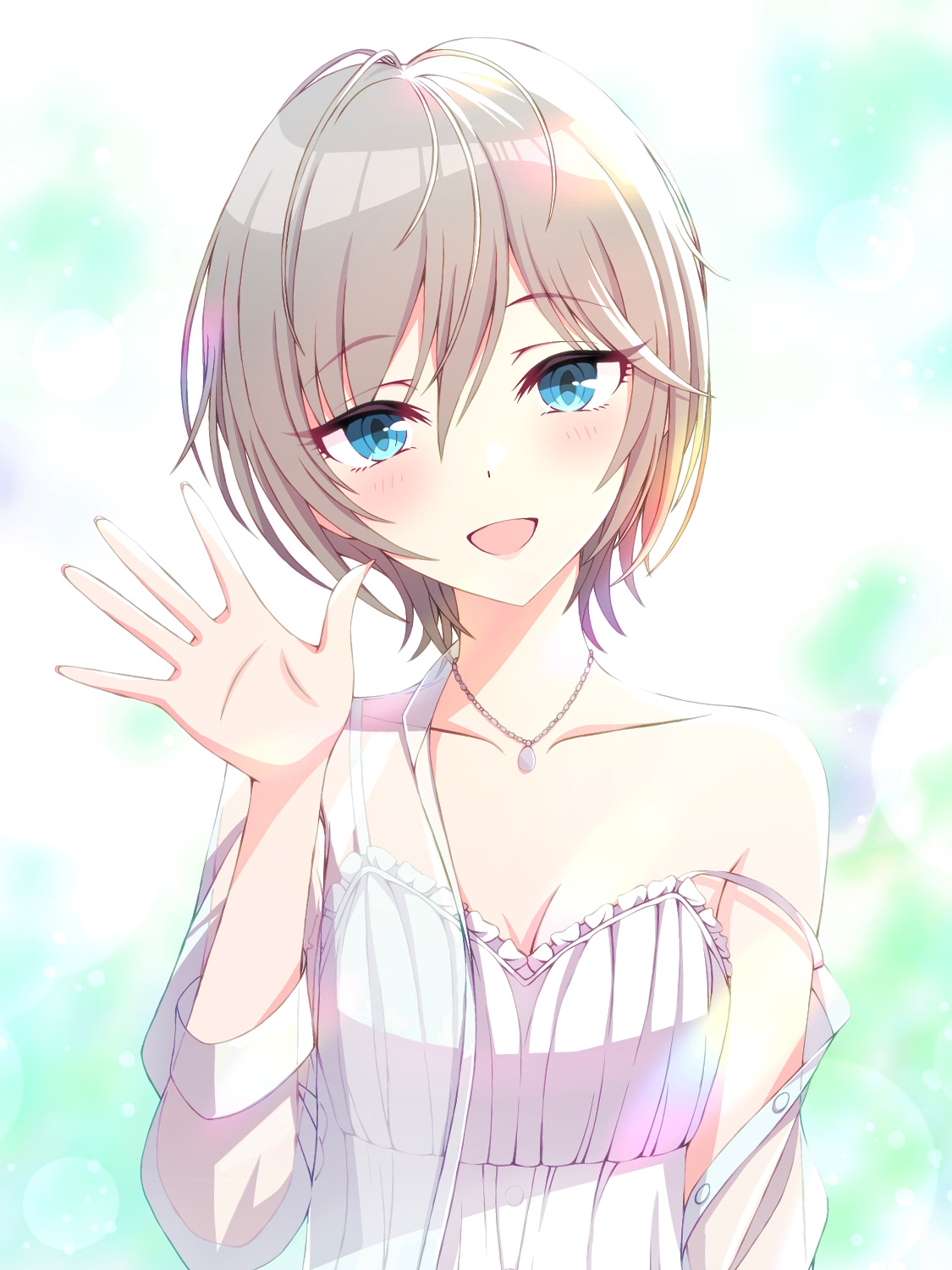 :d1girlblue eyesblushbreastscleavagecollarbonegrey hairhair between eyesjewelrylooking at viewernecklaceoff shoulderopen clothesopen mouthopen shirtshirtshort hairsmall breastssmilesoloupper bodywavingwhite shirt