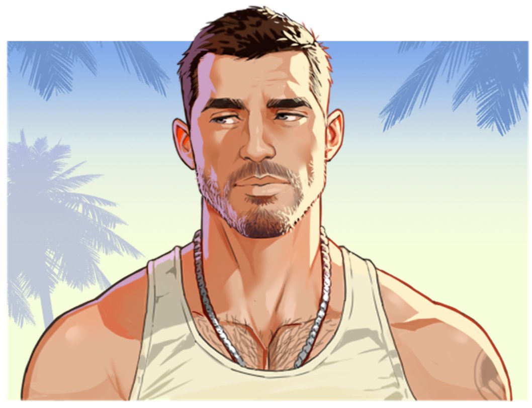 1boyborderbrown hairfacial hairgrey eyesjewelrylooking to the sidemature malenecklacepalm treeshort hairshoulder tattoosparse chest hairtank toptattootreewhite border
