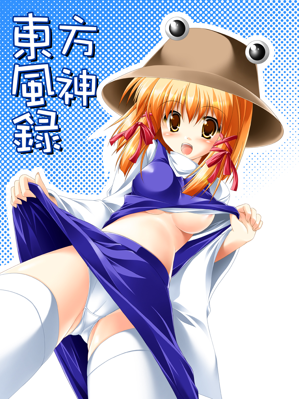 1girlblonde hairbreastscameltoeclothes liftfemale focushair ribbonhatmidriffpantiesribbonshirt liftshort hairskirtskirt liftsolothighhighsunderboobunderwearwhite pantiesyellow eyes