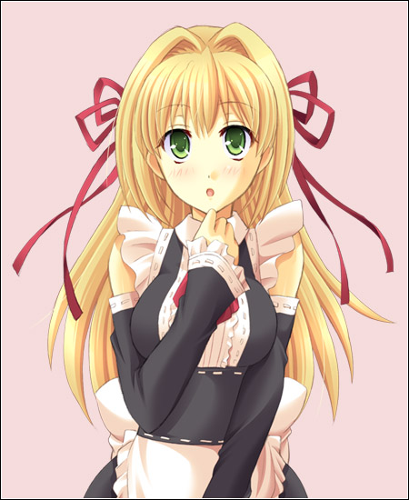 00sada bezariusapronblonde hairblushdetached sleevesgreen eyeshair ribbonlong hairmaidmaid apronopen mouthribbonsolo