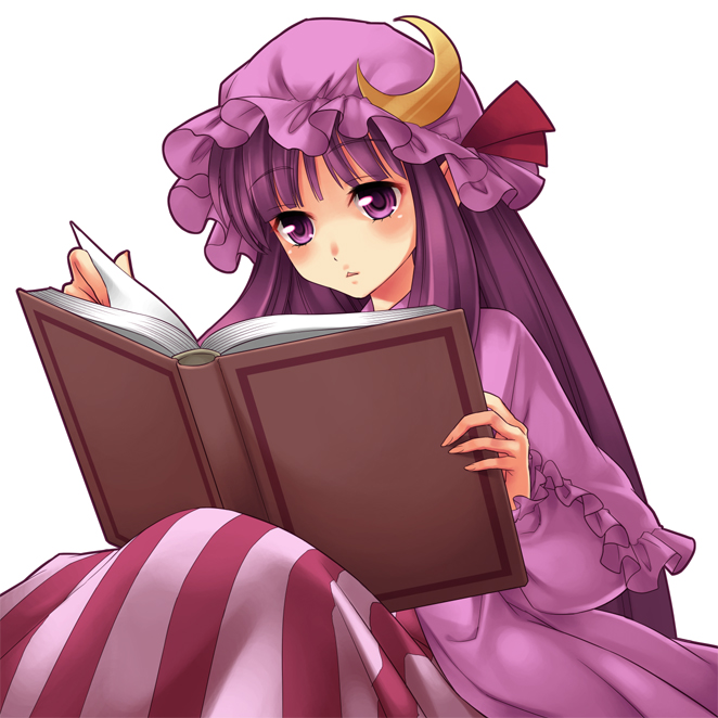 1girlblushbookcrescentcrescent hat ornamentfemale focushathat ornamentlong hairpurple eyespurple hairribbonsimple backgroundsittingsolowhite background