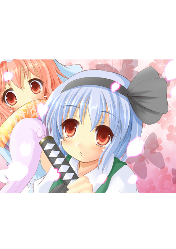 2girlsblushfemale focusfolding fanhairbandhand fankatanalooking at viewermultiple girlspetalspink hairred eyesswordtaremetasselweapon