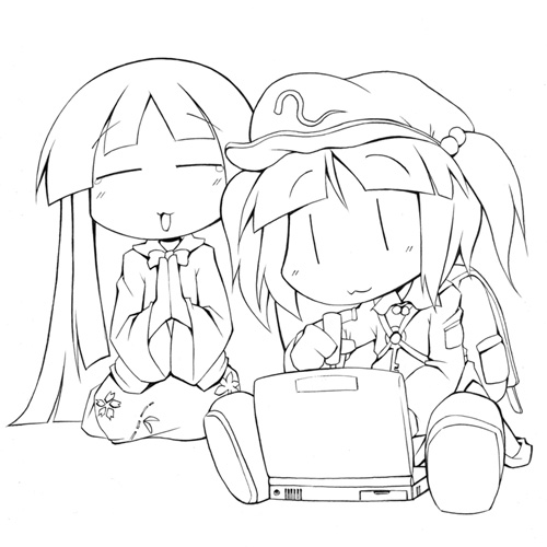 :31boy2girlschibicomputerfemale focusgreyscalehatlaptopmonochromemultiple girlswhite background