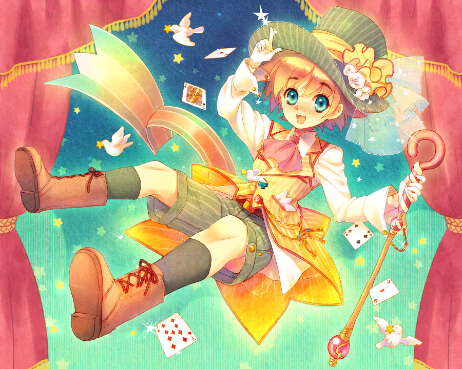 1boybirdblonde hairblue eyesblushcarddovefloating cardfrecklesfull bodygradient backgroundhatmale focusqueen (playing card)queen of spades (playing card)shortssolostar (symbol)