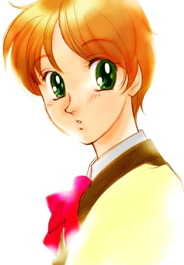 1990s (style)1girlbrown hairfemale focusgreen eyesgreen hairmatching hair/eyesportraitschool uniformshort hairsoloupper body