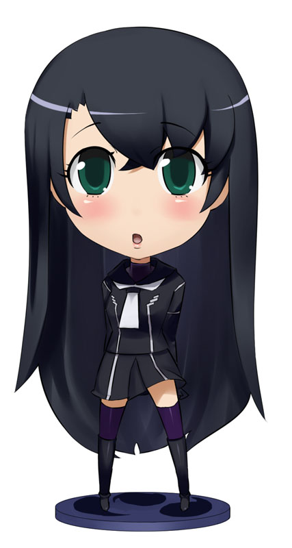 00s1girlblack hairblushchibifemale focusfull bodygreen eyeslong hairsimple backgroundskirtsolothighhighs