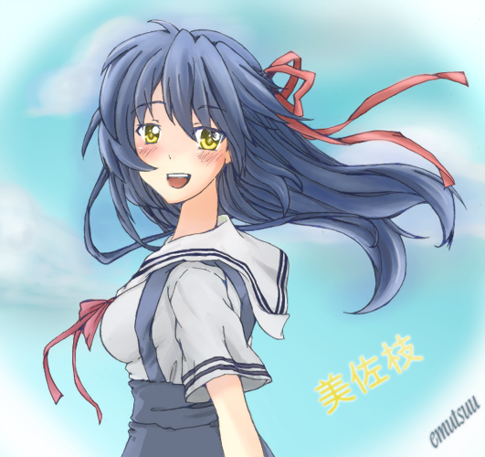 yoshimizu kagami, minegishi ayano, lucky star, lowres, non-web source, 00s, hair over one eye, long hair, orange hair, purple eyes, qvga, ryouou school uniform, school uniform, serafuku, solo, thighhighs