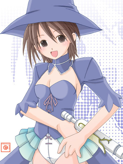 :d00s1girlbodysuitbreastsbrown eyesbrown haircleavagecollarbonecowboy shotfemale focushatleotardlooking at vieweropen mouthscabbardsheathsheathedshort sleevessmilesoloswordweaponwitch hat