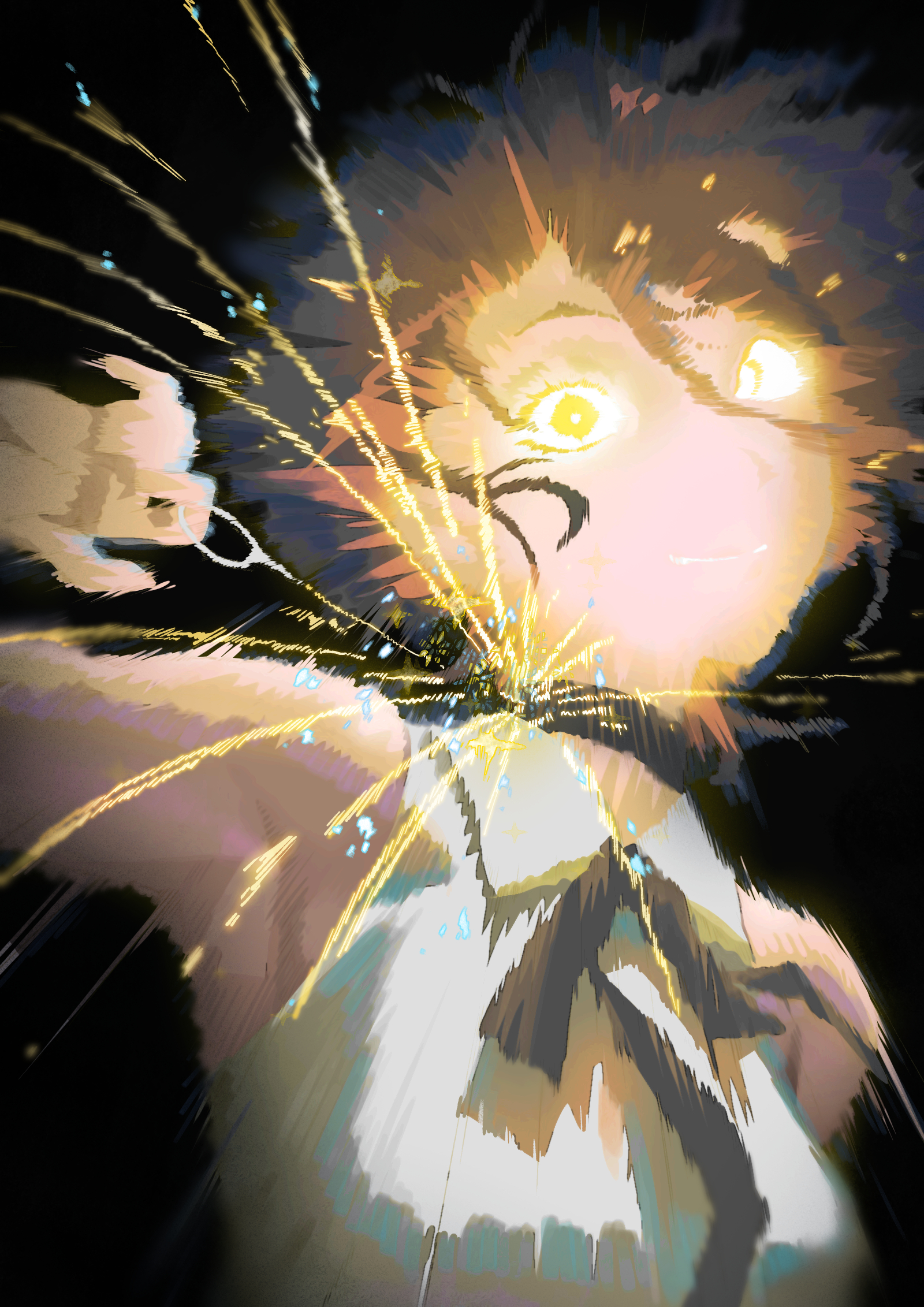 1girlblack backgroundblack chokerblack hairblack ribbonchokerclosed mouthcollared shirtglowingglowing eyesgrenade pinhair between eyesimminent explosionlooking at viewerneck ribbonribbonshirtsolosparkswhite shirtyellow eyes