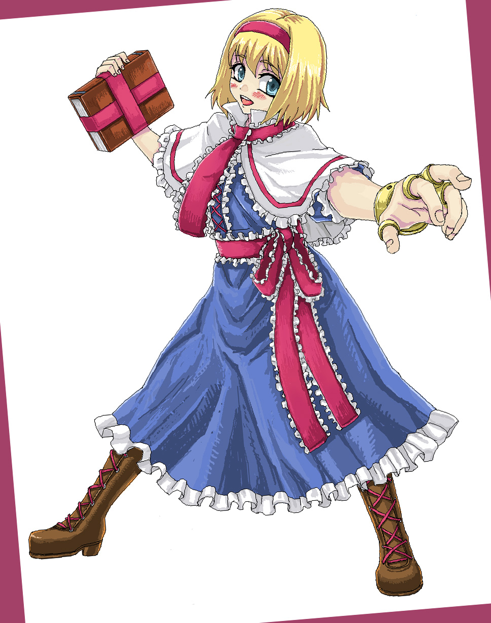 :d1girlaqua eyesblonde hairblue dressblue eyesblushbookbootsbraceletbrown bootscapeletdressfemale focusfrillsfull bodyhairbandholdingholding bookjaggy linesjewelrylooking at vieweropen mouthoutstretched armringshoelacesshort hairsimple backgroundsmilesolostandingwhite background