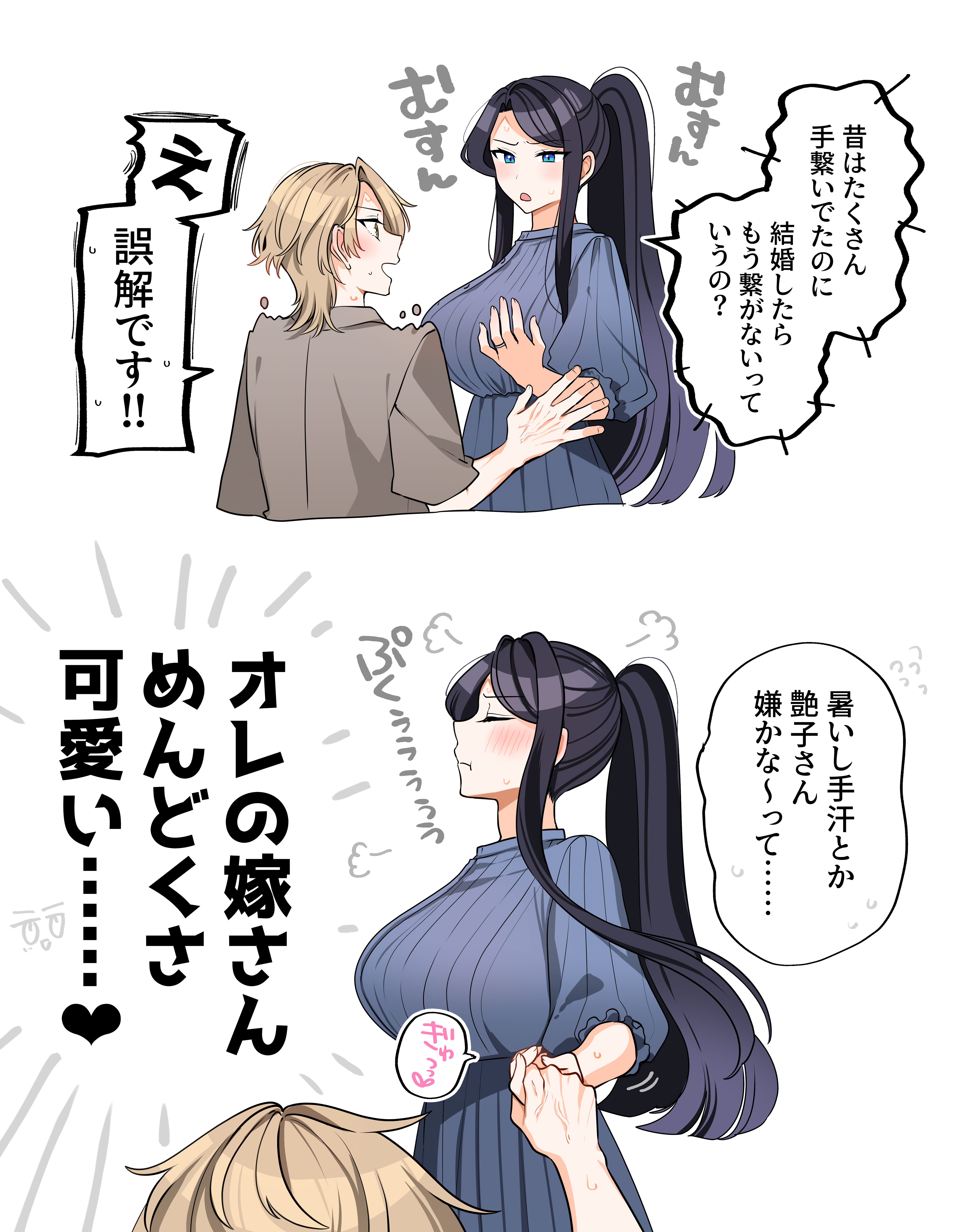 segami daisuke, aigis (persona), morimoto kanaru, yuuki makoto (persona 3), atlus, persona, persona 3, persona trinity soul, translated, 00s, android, blonde hair, blue eyes, blue hair, blush, comic, crossover, school uniform, sweatdrop